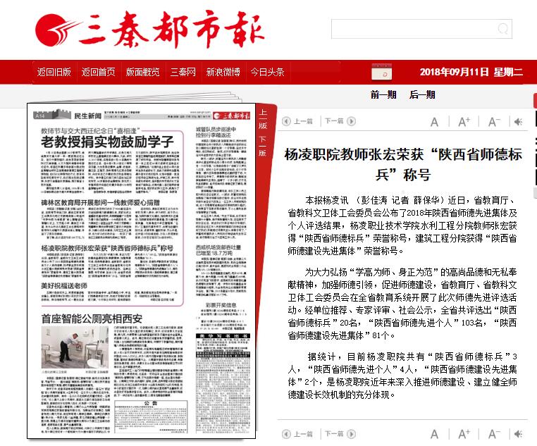 本报杨凌讯 (彭佳涛 记者 薛保华)近日,省教育厅、省教科文卫体工会委员会公布了2018年陕西省师德先进集体及个人评选结果,杨凌职业技术学院水利工程分院教师张宏获得“陕西省师德标兵”荣誉称号,建筑工程分院获得“陕西省师德建设先进集体”荣誉称号。