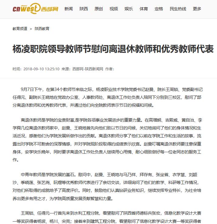 9月7日下午,在第34个教师节来临之际,杨凌职业技术学院党委书记赵曼、院长王周锁、党委副书记任得元、副院长王晓地在党政办公室、人事教师处、离退休工作处负责人陪同下分别到三校区,慰问了部分离退休教师和优秀教师代表,并通过他们向全院教师表示节日的祝福和问候。