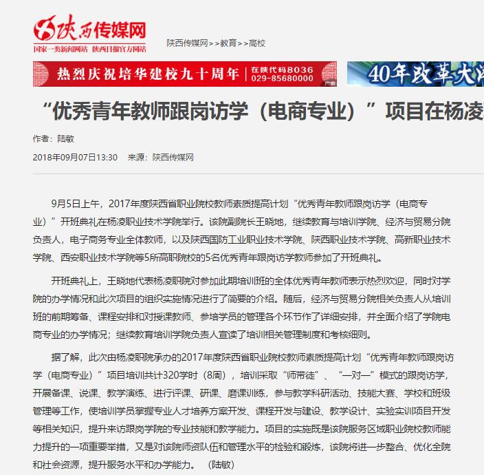 9月5日上午,2017年度陕西省职业院校教师素质提高计划“优秀青年教师跟岗访学(电商专业)”开班典礼在杨凌职业技术学院举行。该院副院长王晓地,继续教育与培训学院、经济与贸易分院负责人,电子商务专业全体教师,以及陕西国防工业职业技术学院、陕西职业技术学院、高新职业技术学院、西安职业技术学院等5所高职院校的5名优秀青年跟岗访学教师参加了开班典礼。