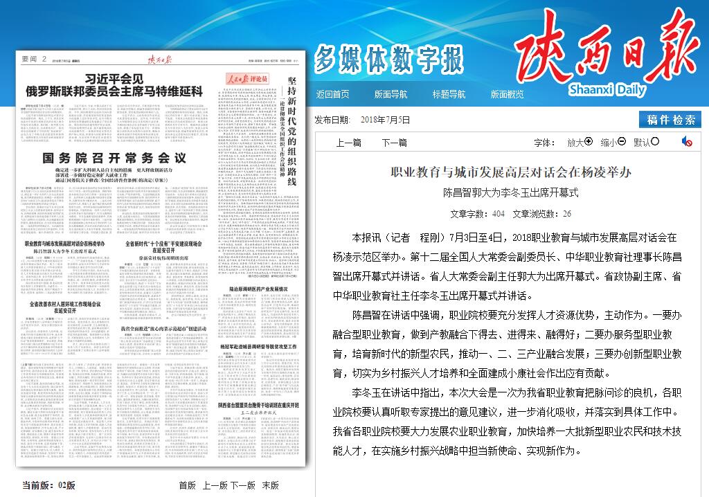 本报讯(记者 程刚)7月3日至4日,2018职业教育与城市发展高层对话会在杨凌示范区举办。第十二届全国人大常委会副委员长、中华职业教育社理事长陈昌智出席开幕式并讲话。省人大常委会副主任郭大为出席开幕式。省政协副主席、省中华职业教育社主任李冬玉出席开幕式并讲话。 陈昌智在讲话中强调,职业院校要充分发挥人才资源优势,主动作为。一要办融合型职业教育,做到产教融合下得去、进得来、融得好;二要办服务型职业教育,培育新时代的新型农民,推动一、二、三产业融合发展;三要办创新型职业教育,切实为乡村振兴人才培养和全面建成小康社会作出应有贡献。 李冬玉在讲话中指出,本次大会是一次为我省职业教育把脉问诊的良机,各职业院校要认真听取专家提出的意见建议,进一步消化吸收,并落实到具体工作中。我省各职业院校要大力发展农业职业教育,加快培养一大批新型职业农民和技术技能人才,在实施乡村振兴战略中担当新使命、实现新作为。
