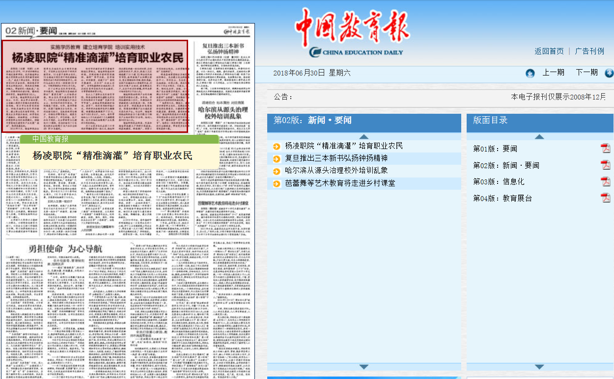 6月30日《中国教育报》新闻版头条,以“实施学历教育 建立培育学院 培训实用技术,杨凌职院‘精准滴灌’培育职业农民”为题对我院工作进行了报道(详情进入)