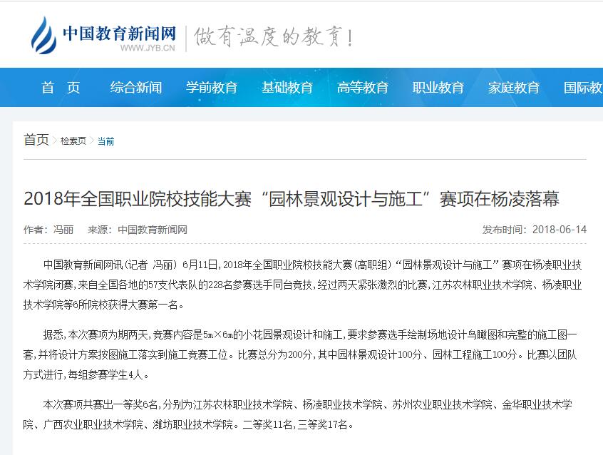 中国教育新闻网讯(记者 冯丽) 6月11日,2018年全国职业院校技能大赛(高职组)“园林景观设计与施工”赛项在杨凌职业技术学院闭赛,来自全国各地的57支代表队的228名参赛选手同台竞技,经过两天紧张激烈的比赛,江苏农林职业技术学院、杨凌职业技术学院等6所院校获得大赛第一名。