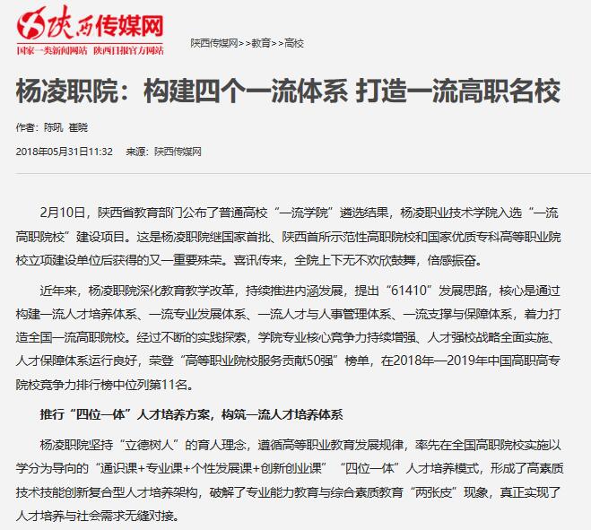 近年来,杨凌职院深化教育教学改革,持续推进内涵发展,提出“61410”发展思路,核心是通过构建一流人才培养体系、一流专业发展体系、一流人才与人事管理体系、一流支撑与保障体系,着力打造全国一流高职院校。经过不断的实践探索,学院专业核心竞争力持续增强、人才强校战略全面实施、人才保障体系运行良好,荣登“高等职业院校服务贡献50强”榜单,在2018年—2019年中国高职高专院校竞争力排行榜中位列第11名。
