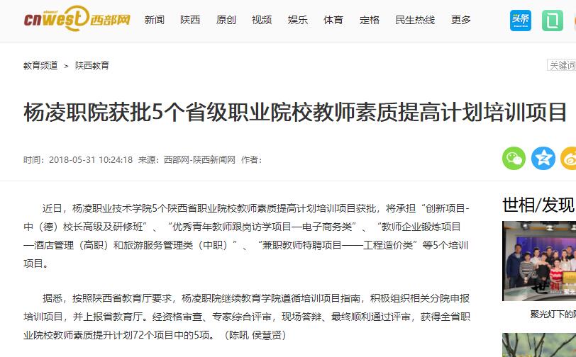 据悉,按照陕西省教育厅要求,杨凌职院继续教育学院遵循培训项目指南,积极组织相关分院申报培训项目,并上报省教育厅。经资格审查、专家综合评审,现场答辩、最终顺利通过评审,获得全省职业院校教师素质提升计划72个项目中的5项。
