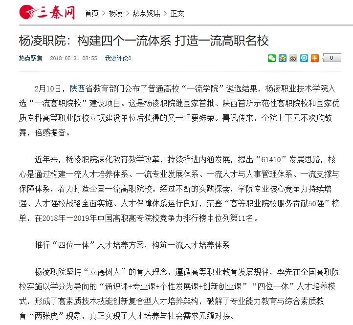 近年来,杨凌职院深化教育教学改革,持续推进内涵发展,提出“61410”发展思路,核心是通过构建一流人才培养体系、一流专业发展体系、一流人才与人事管理体系、一流支撑与保障体系,着力打造全国一流高职院校。经过不断的实践探索,学院专业核心竞争力持续增强、人才强校战略全面实施、人才保障体系运行良好,荣登“高等职业院校服务贡献50强”榜单,在2018年—2019年中国高职高专院校竞争力排行榜中位列第11名。