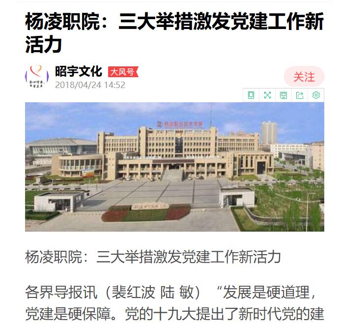 近日,在首届全国高职高专“优质校”建设与评价论坛发布的《中国大学及学科专业评价报告(2018)》中,杨凌职院在2018年—2019年中国高职高专院校竞争力排行榜中位列第11名,在陕西高职位列首位。这是杨凌职院创新党建工作方法、激活基层党建活力的生动体现。