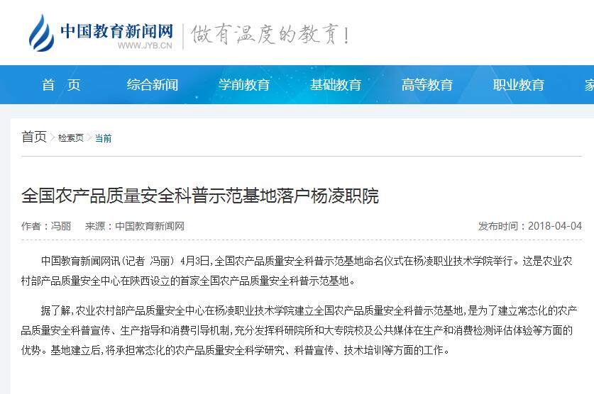 中国教育新闻网讯(记者 冯丽) 4月3日,全国农产品质量安全科普示范基地命名仪式在杨凌职业技术学院举行。这是农业农村部产品质量安全中心在陕西设立的首家全国农产品质量安全科普示范基地。