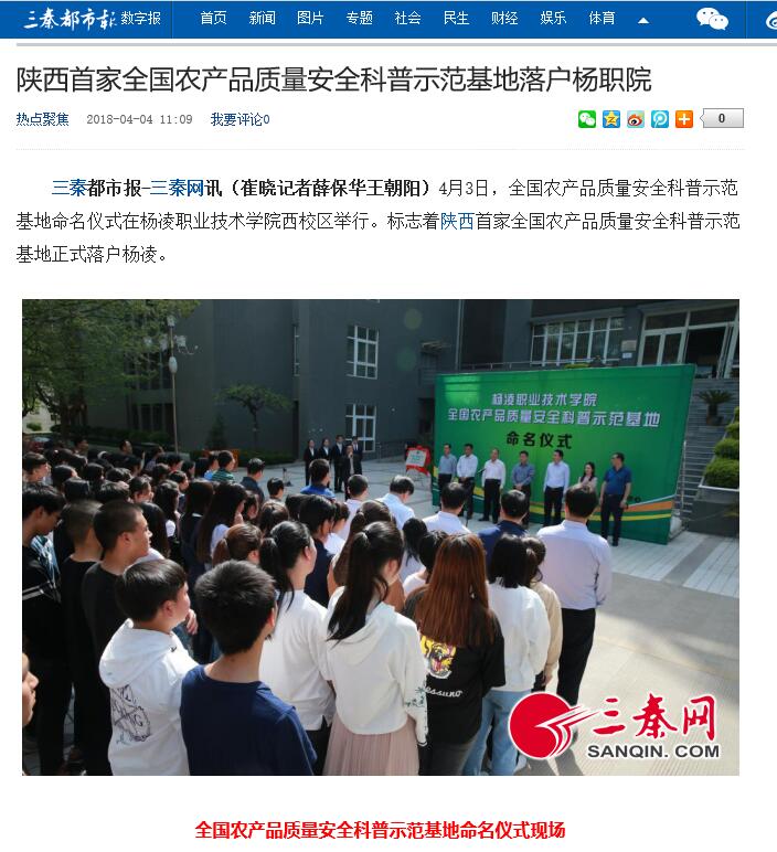 三秦都市报-三秦网讯(崔晓记者薛保华王朝阳)4月3日,全国农产品质量安全科普示范基地命名仪式在杨凌职业技术学院西校区举行。标志着陕西首家全国农产品质量安全科普示范基地正式落户杨凌。