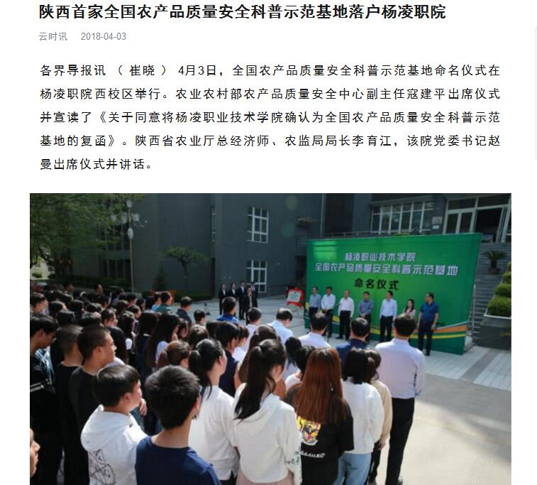 各界导报讯 ( 崔晓 ) 4月3日,全国农产品质量安全科普示范基地命名仪式在杨凌职院西校区举行。农业农村部农产品质量安全中心副主任寇建平出席仪式并宣读了《关于同意将杨凌职业技术学院确认为全国农产品质量安全科普示范基地的复函》。陕西省农业厅总经济师、农监局局长李育江,该院党委书记赵曼出席仪式并讲话。