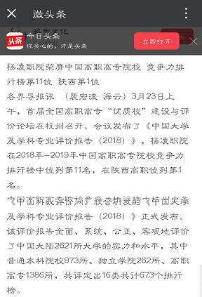 各界导报讯 (裴宏波 海云)3月23日上午,首届全国高职高专“优质校”建设与评价论坛在杭州召开。会议发布了《中国大学及学科专业评价报告(2018)》,杨凌职院在2018年-2019年中国高职高专院校竞争力排行榜中位列第11名,在陕西高职位列第1名。 中国高职高专院校竞争力排行榜由杭州电子科技大学中国科教评价研究院(CASEE)、武汉大学中国科学评价研究中心(RCCSE)、中国教育质量评价中心和《中国科教评价网》联合研发的《中国大学及学科专业评价报告(2018)》正式发布。该评价报告全面、系统、公正、客观地评价了中国大陆2621所大学的实力和水平,其中普通本科院校973所、独立学院262所、高职高专1386所,共评定出16类共计673个排行榜。