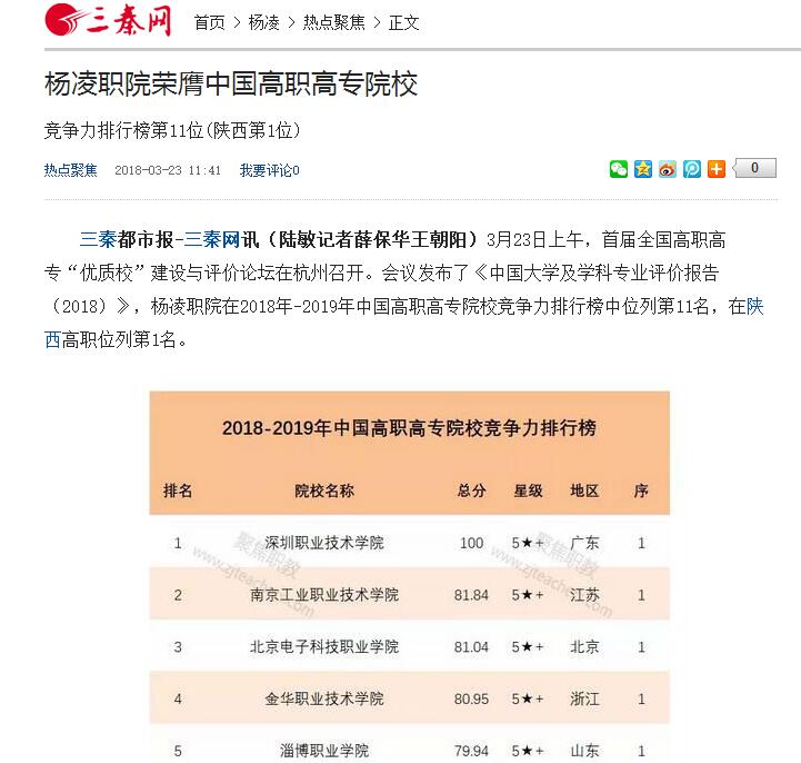 三秦都市报-三秦网讯(陆敏记者薛保华王朝阳)3月23日上午,首届全国高职高专“优质校”建设与评价论坛在杭州召开。会议发布了《中国大学及学科专业评价报告(2018)》,杨凌职院在2018年-2019年中国高职高专院校竞争力排行榜中位列第11名,在陕西高职位列第1名。
