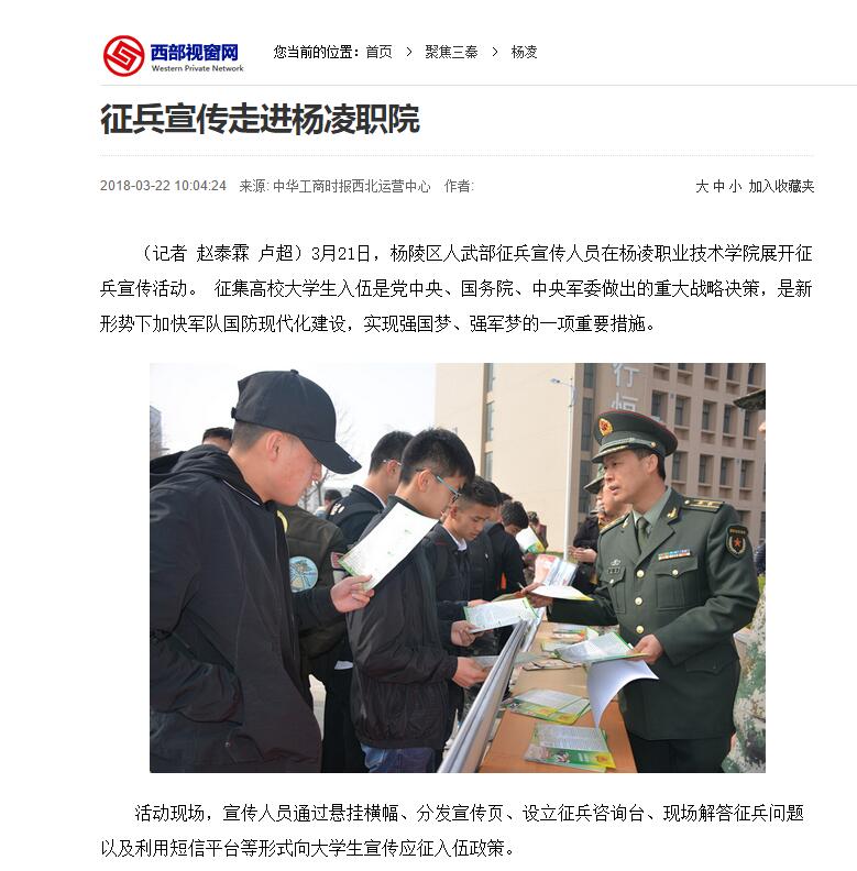 杨陵区人武部李正文部长告诉记者:“做好征兵工作,向部队输送优质兵源,是直接关系我国国防安全的大事。大学生应征入伍是提高兵源质量,促进国防现代化,推动军队科学发展,提高大学生全面素质的战略使命,是富国强军的重要举措。”