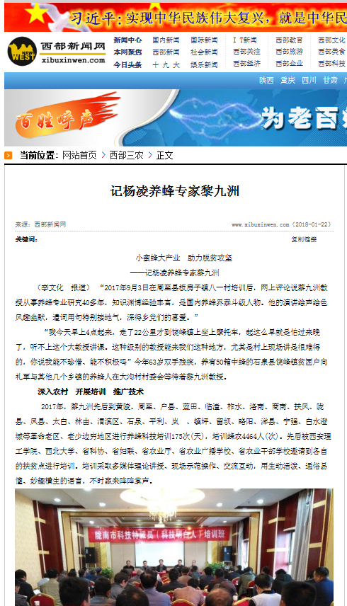 (李文化 报道) “2017年9月3日在周至县板房子镇八一村培训后,网上评论说黎九洲教授从事养蜂专业研究40多年,知识渊博经验丰富,是国内养蜂界泰斗级人物。他的演讲绘声绘色风趣幽默,遣词用句特别接地气,深得乡党们的喜爱。”