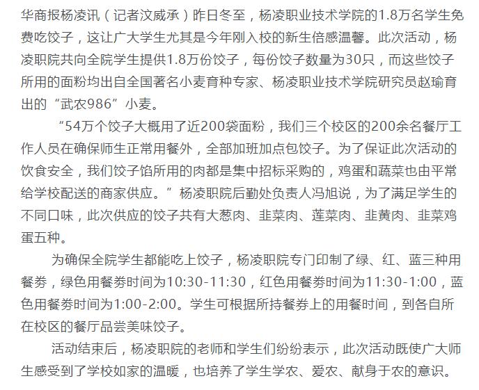 华商报杨凌讯(记者汶威承)昨日冬至,杨凌职业技术学院的1.8万名学生免费吃饺子,这让广大学生尤其是今年刚入校的新生倍感温馨。此次活动,杨凌职院共向全院学生提供1.8万份饺子,每份饺子数量为30只,而这些饺子所用的面粉均出自全国著名小麦育种专家、杨凌职业技术学院研究员赵瑜育出的“武农986”小麦。