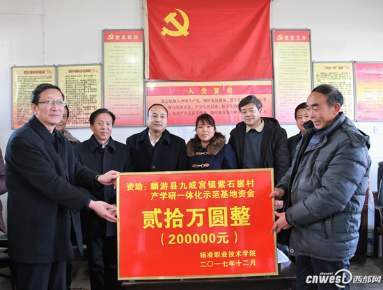 12月15日,为贯彻落实 《全省脱贫攻坚 2017冬季行动方案》精神,扎实推进高校结对帮扶“双百工程”,有效地为当地特色产业服务,杨凌职业技术学院党委书记赵曼、党委副书记任得元一行来到麟游县九成宫镇紫石崖村,为该村捐赠20万元,用于建立中蜂养殖产学研一体化示范基地、核桃丰产栽培产学研一体化示范基地及电商网络平台。