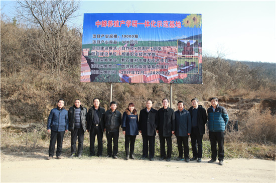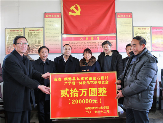 12月15日,杨凌职业技术学院党委书记赵曼、党委副书记任得元一行来到麟游县九成宫镇紫石崖村,为该村捐赠20万元,用于建立中蜂养殖产学研一体化示范基地、核桃丰产栽培产学研一体化示范基地及电商网络平台。