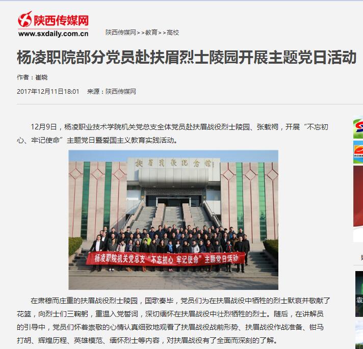 12月9日,杨凌职业技术学院机关党总支全体党员赴扶眉战役烈士陵园、张载祠,开展“不忘初心、牢记使命”主题党日暨爱国主义教育实践活动。