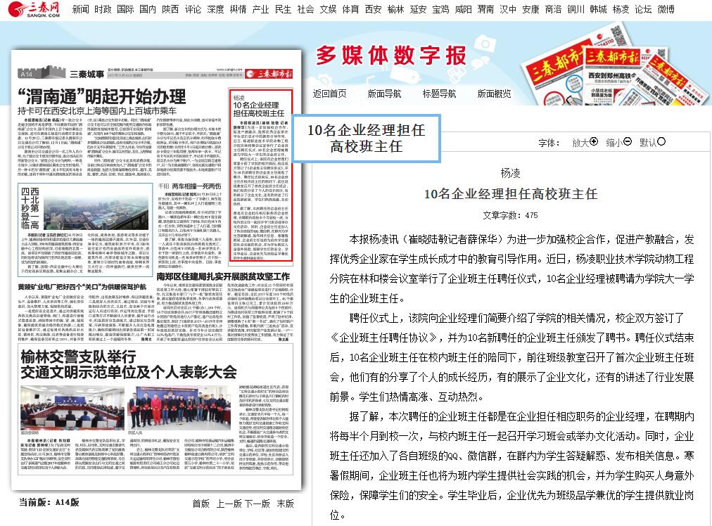 本报杨凌讯(崔晓陆敏记者薛保华)为进一步加强校企合作,促进产教融合,发挥优秀企业家在学生成长成才中的教育引导作用。近日,杨凌职业技术学院动物工程分院在林和楼会议室举行了企业班主任聘任仪式,10名企业经理被聘请为学院大一学生的企业班主任。 聘任仪式上,该院向企业经理们简要介绍了学院的相关情况,校企双方签订了《企业班主任聘任协议》,并为10名新聘任的企业班主任颁发了聘书。聘任仪式结束后,10名企业班主任在校内班主任的陪同下,前往班级教室召开了首次企业班主任班会,他们有的分享了个人的成长经历,有的展示了企业文化,还有的讲述了行业发展前景。学生们热情高涨、互动热烈。 据了解,本次聘任的企业班主任都是在企业担任相应职务的企业经理,在聘期内将每半个月到校一次,与校内班主任一起召开学习班会或举办文化活动。同时,企业班主任还加入了各自班级的QQ、微信群,在群内为学生答疑解惑、发布相关信息。寒暑假期间,企业班主任也将为班内学生提供社会实践的机会,并为学生购买人身意外保险,保障学生们的安全。学生毕业后,企业优先为班级品学兼优的学生提供就业岗位。