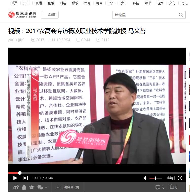 11月11日,凤凰网视频以《2017农高会专访杨凌职业技术学院教授 马文哲》为题,报道了我院马文哲教授介绍我院参加农高会,科技扶贫的新闻。
