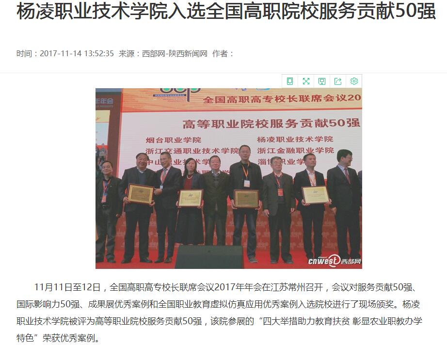 11月11日至12日,全国高职高专校长联席会议2017年年会在江苏常州召开,会议对服务贡献50强、国际影响力50强、成果展优秀案例和全国职业教育虚拟仿真应用优秀案例入选院校进行了现场颁奖。杨凌职业技术学院被评为高等职业院校服务贡献50强,该院参展的“四大举措助力教育扶贫 彰显农业职教办学特色”荣获优秀案例。