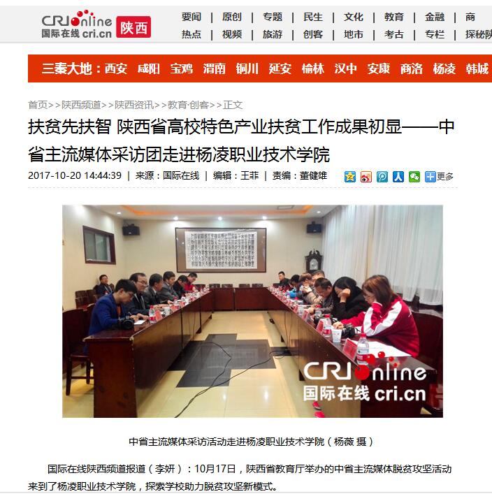 国际在线陕西频道报道(李妍):10月17日,陕西省教育厅举办的中省主流媒体脱贫攻坚活动来到了杨凌职业技术学院,探索学校助力脱贫攻坚新模式。