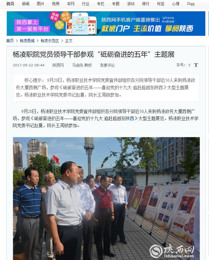 9月20日,杨凌职业技术学院党委宣传部组织各分院领导干部近50人来到杨凌政务大厦西侧广场,参观《砥砺奋进的五年——喜迎党的十九大 追赶超越在陕西》大型主题展览。杨凌职业技术学院党委书记赵曼,院长王周锁参加。