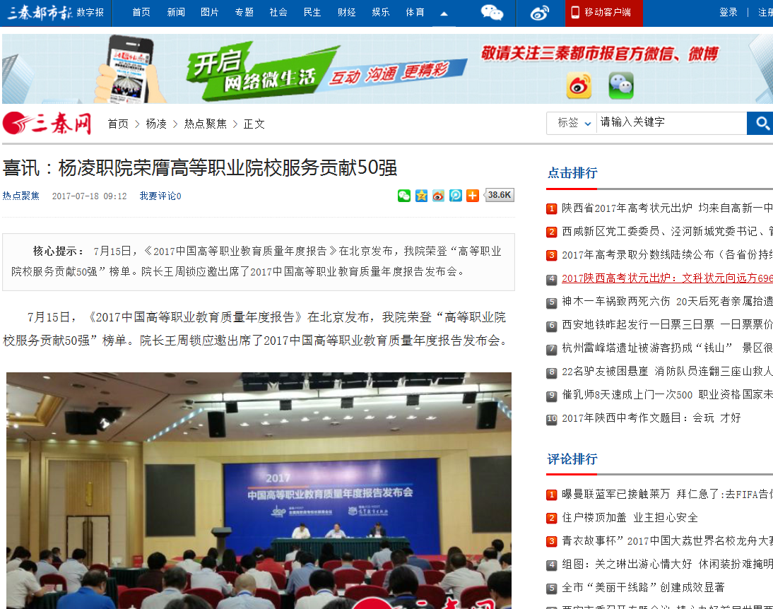7月15日,《2017中国高等职业教育质量年度报告》在北京发布,我院荣登“高等职业院校服务贡献50强”榜单。院长王周锁应邀出席了2017中国高等职业教育质量年度报告发布会。