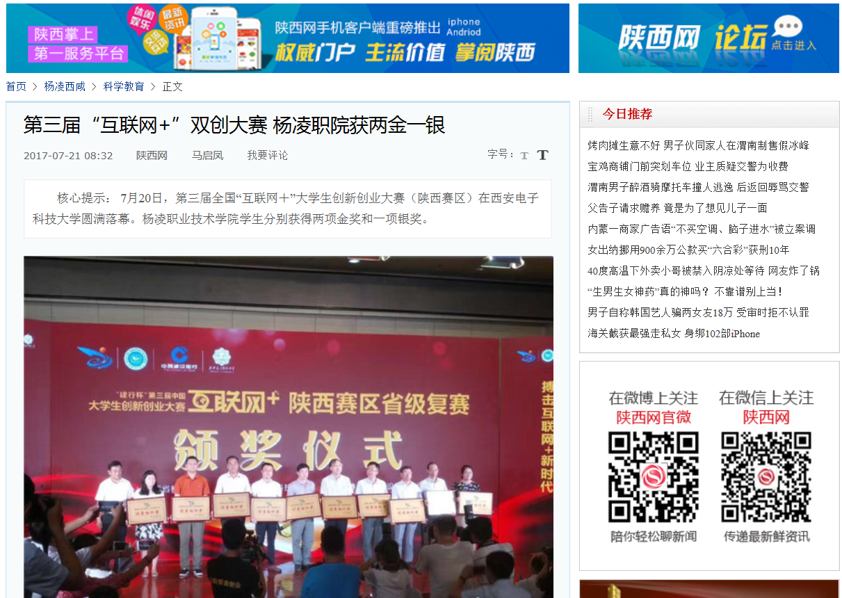 核心提示: 7月20日,第三届全国“互联网+”大学生创新创业大赛(陕西赛区)在西安电子科技大学圆满落幕。杨凌职业技术学院学生分别获得两项金奖和一项银奖。