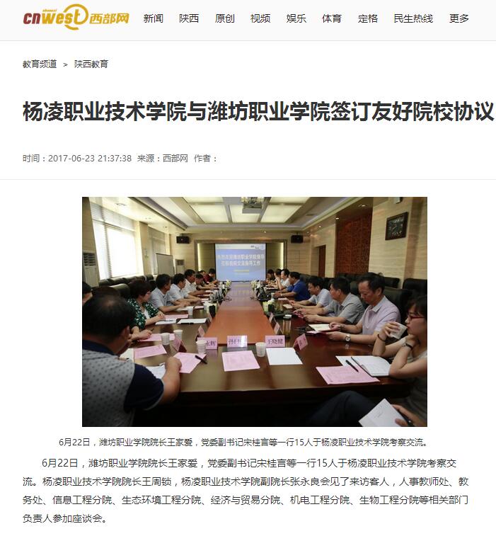 为增强两校间交流合作,本着“优势互补、友好合作、互利共赢、共同发展”的原则,杨凌职业技术学院与潍坊职业学院经协商缔结为友好学校,签订了《友好学校协议》,双方表示,今后将进一步加强彼此校际交往,增进了解、互相学习,在办学理念、人才培养、教学改革、专业建设等诸多方面展开广泛交流与合作,共谋高职院校发展大计,谱写新的辉煌篇章。