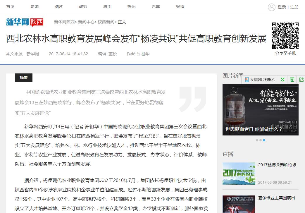 【新华网】西北农林水高职教育发展峰会发布“杨凌共识” 共促高职教育创新发展