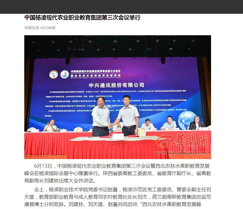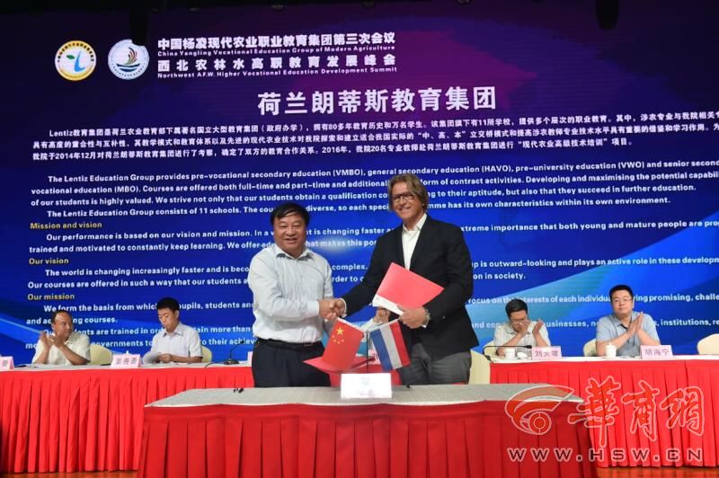 会上,杨凌职业技术学院党委书记赵曼,杨凌示范区党工委委员、管委会副主任刘天雄,教育部职业教育与成人教育司农村教育处处长刘杰,荷兰朗蒂斯教育集团总监范康普博士分别致辞。刘建林、刘天雄、赵曼共同启动“西北农林水高职教育发展峰会”仪式,中国杨凌现代农业职业教育集团秘书长、杨凌职业技术学院副院长、西北农林水高职教育发展峰会秘书长张永良介绍了峰会发起相关情况。中国杨凌现代农业职业教育集团与荷兰朗蒂斯教育集团签订了《开展涉农专业职业教育师资培训和技术咨询》合作备忘录;杨凌职业技术学院与中兴通讯股份有限公司签订了“中兴通信学院”共建协议书,并举行了揭牌仪式。