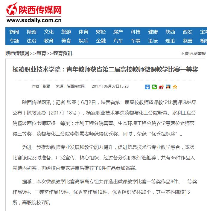 陕西传媒网讯(记者 张亚)6月2日,陕西省第二届高校教师微课教学比赛评选结果公布(陕教师办〔2017〕18号),杨凌职业技术学院药物与化工分院靳淼、水利工程分院杨波两位老师获得一等奖;水利工程分院雷蕾、生态环境工程分院衣学慧两位老师获得三等奖,药物与化工分院李黔蜀老师获得优秀奖。同时,荣获“优秀组织奖”。