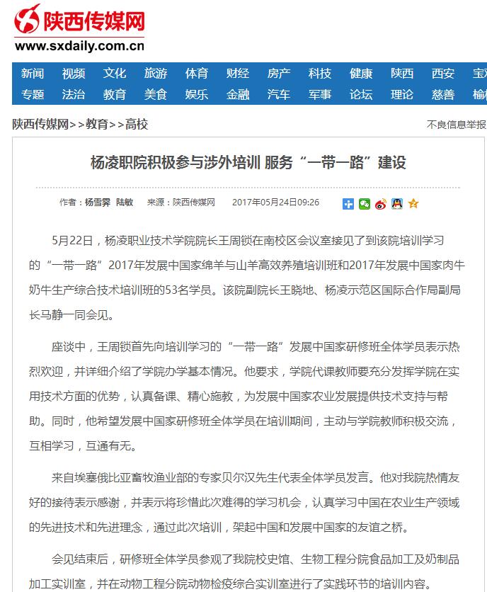 2016年,教育部实施“推进共建‘一带一路’教育行动”,为推动区域教育大开放、大交流、大融合提供了大契机。为充分发挥该院在实用技术方面的科技和教学优势,2016年起,该院联合杨凌示范区先后承担多项商务部对外援助实用技术培训任务,在职业教育方面的国际影响力不断扩大。根据今年培训安排,该院还将举办两期对“一带一路”沿线国家基础建设方面的技术培训任务。(杨雪霁 陆敏)