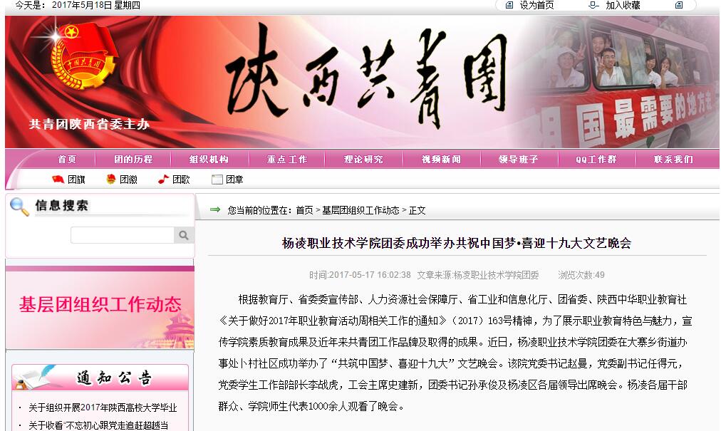 根据教育厅、省委委宣传部、人力资源社会保障厅、省工业和信息化厅、团省委、陕西中华职业教育社《关于做好2017年职业教育活动周相关工作的通知》(2017)163号精神,为了展示职业教育特色与魅力,宣传学院素质教育成果及近年来共青团工作品牌及取得的成果。近日,杨凌职业技术学院团委在大寨乡街道办事处卜村社区成功举办了“共筑中国梦、喜迎十九大”文艺晚会。该院党委书记赵曼,党委副书记任得元,党委学生工作部部长李战虎,工会主席史建新,团委书记孙承俊及杨凌区各届领导出席晚会。杨凌各届干部群众、学院师生代表1000余人观看了晚会。