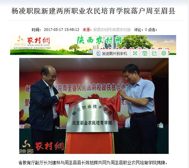 陕西农村网讯(裴洪波 陆敏 记者王平) 5月16日,杨凌职业技术学院新建的两所职业农民培育学院分别在周至县和眉县挂牌成立,这一举措,标志着杨凌职业技术学院与政府间的校政扶贫合作不断推向深入。