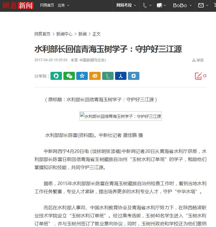 而后在水利部人事司、中国水利教育协会及青海省水利厅努力下,在陕西杨凌职业技术学院设立“玉树水利订单班”。经过高考选拔,玉树40名学生进入“玉树水利订单班”,并与玉树州签订了就业意向协议,同时,玉树州政府和学校还为他们缴纳了两年的学费。