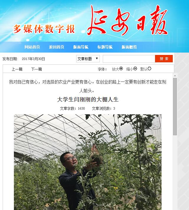 3月21日,记者在子长县史家畔见到了闫刚刚,他戴着一副大大的黑框眼镜,精干中带着一丝书生气。在农村人的传统观念中,念了书就能跃出农门,但闫刚刚大学还没毕业就一头扎进农门,开始种大棚了。
