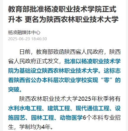日前,教育部致函陕西省人民政府,陕西省人民政府正式发文,批准以杨凌职业技术学院为基础设立陕西农林职业技术大学。这标志着陕西省公办本科层次职业学校实现“零”的突破。