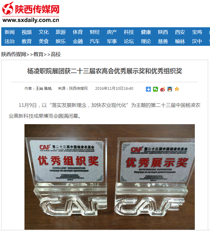 在本届农高会上,杨凌职院在高新技术馆举办科技成果展示,集中展示近年来在科技创新与推广等方面的新成果、新技术。经科研推广处精心策划,认真组织,努力工作,该院展团以展位设计新颖,项目实用性强,实物地方特色明显受到了广大参会群众和组委会的一致好评,被农高会组委会授予优秀组织奖和优秀展示奖。