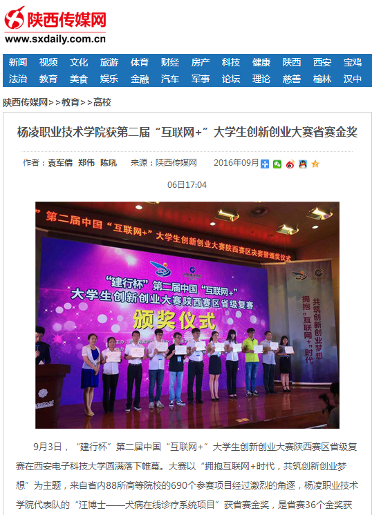 9月3日,“建行杯”第二届中国“互联网+”大学生创新创业大赛陕西赛区省级复赛在西安电子科技大学圆满落下帷幕。大赛以“拥抱互联网+时代,共筑创新创业梦想”为主题,来自省内88所高等院校的690个参赛项目经过激烈的角逐,杨凌职业技术学院代表队的“汪博士——犬病在线诊疗系统项目”获省赛金奖,是省赛36个金奖获得者中仅有的两所高职院校获奖项目之一。该院另外6个项目获省赛铜奖。同时,学院也获得了第二届中国“互联网+”大学生创新创业大赛陕西赛区优秀组织奖。