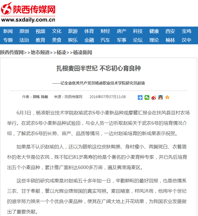 武功县武功镇凉马村被称为“武农148种子村”。在赵瑜的帮助下,凉马村不仅实现了小麦增产、农民增收,还通过良种繁育实践和科技进村入户,提高了农民科技文化水平,使大家学会了良种繁育技术。对此,赵瑜却说:“凉马村也为小麦良种造福更多的农民群众发挥了积极作用。”
