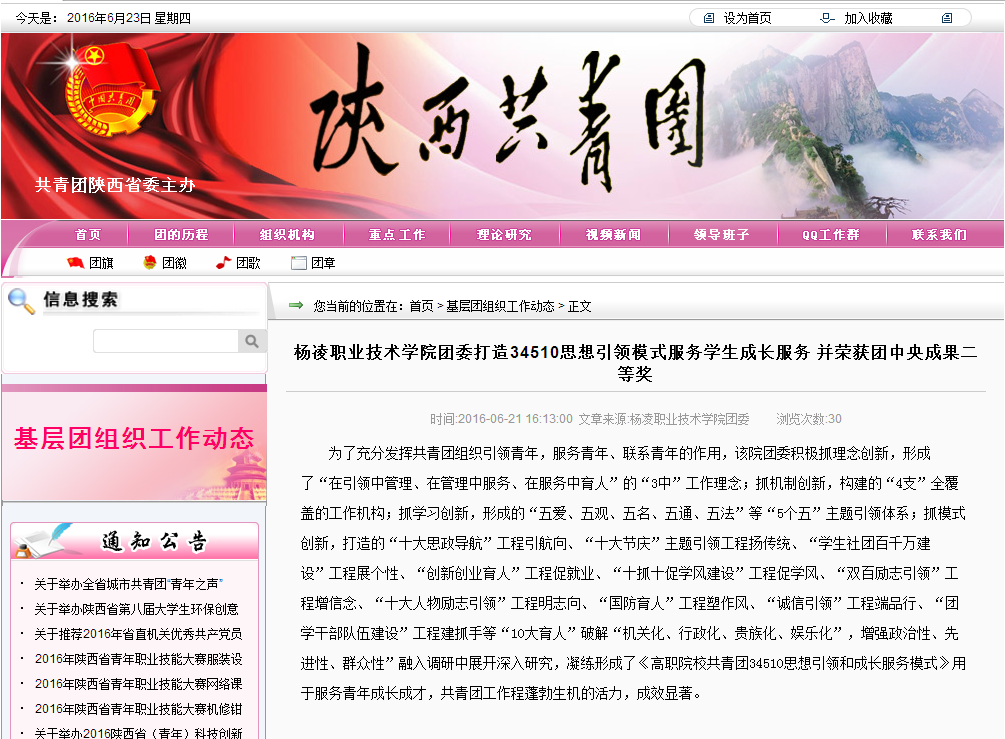 为了充分发挥共青团组织引领青年,服务青年、联系青年的作用,该院团委积极抓理念创新,形成了“在引领中管理、在管理中服务、在服务中育人”的“3中”工作理念;抓机制创新,构建的“4支”全覆盖的工作机构;抓学习创新,形成的“五爱、五观、五名、五通、五法”等“5个五”主题引领体系;抓模式创新,打造的“十大思政导航”工程引航向、“十大节庆”主题引领工程扬传统、“学生社团百千万建设”工程展个性、“创新创业育人”工程促就业、“十抓十促学风建设”工程促学风、“双百励志引领”工程增信念、“十大人物励志引领”工程明志向、“国防育人”工程塑作风、“诚信引领”工程端品行、“团学干部队伍建设”工程建抓手等“10大育人”破解“机关化、行政化、贵族化、娱乐化”,增强政治性、先进性、群众性”融入调研中展开深入研究,凝练形成了《高职院校共青团34510思想引领和成长服务模式》用于服务青年成长成才,共青团工作程蓬勃生机的活力,成效显著。