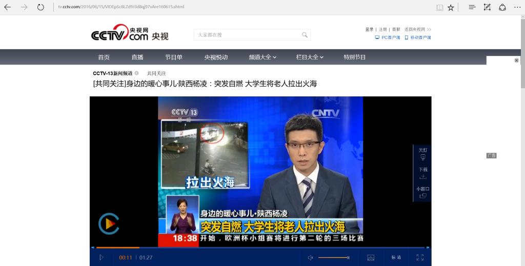 【中央电视台】身边的暖心事儿·陕西杨凌:突发自燃 大学生将老人拉出火海