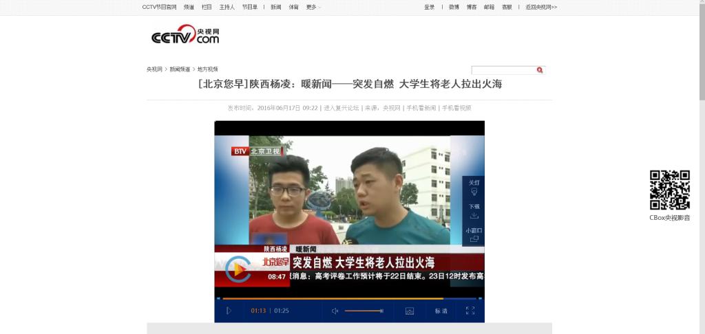 【央视网】陕西杨凌:暖新闻——突发自燃 大学生将老人拉出火海