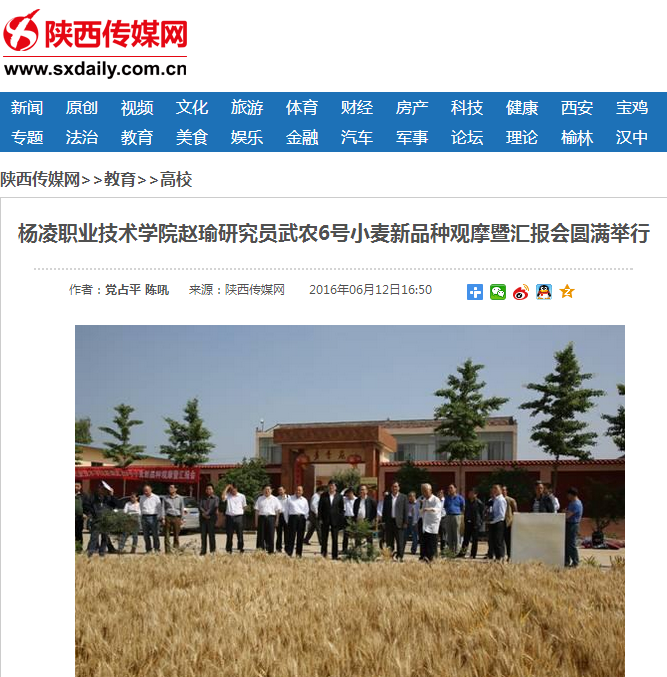 6月3日,杨凌职业技术学院赵瑜武农6号小麦新品种观摩暨汇报会在学院豆村农场举办,陕西省委高教工委书记李仲为、陕西省教育厅厅长王建利、杨凌示范区党工委书记郭社荣、杨陵区委书记张启东等领导及省农业厅、杨凌示范区、省种子管理站、咸阳市、宝鸡市及杨凌区、扶风县有关领导及相关部门专业技术人员出席了会议。杨凌职业技术学院党委书记赵曼致词,院长王周锁主持会议。