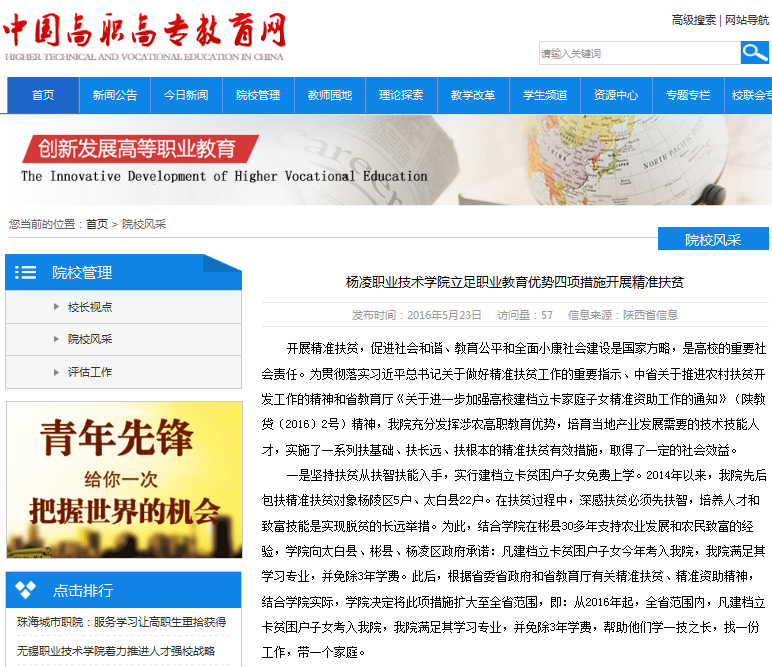 开展精准扶贫,促进社会和谐、教育公平和全面小康社会建设是国家方略,是高校的重要社会责任。为贯彻落实习近平总书记关于做好精准扶贫工作的重要指示、中省关于推进农村扶贫开发工作的精神和省教育厅《关于进一步加强高校建档立卡家庭子女精准资助工作的通知》(陕教贷〔2016〕2号)精神,我院充分发挥涉农高职教育优势,培育当地产业发展需要的技术技能人才,实施了一系列扶基础、扶长远、扶根本的精准扶贫有效措施,取得了一定的社会效益。