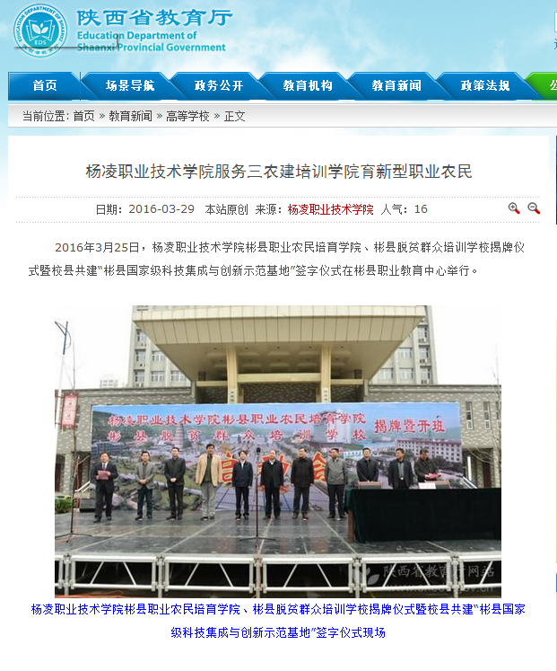 2016年3月25日,杨凌职业技术学院彬县职业农民培育学院、彬县脱贫群众培训学校揭牌仪式暨校县共建“彬县国家级科技集成与创新示范基地”签字仪式在彬县职业教育中心举行。