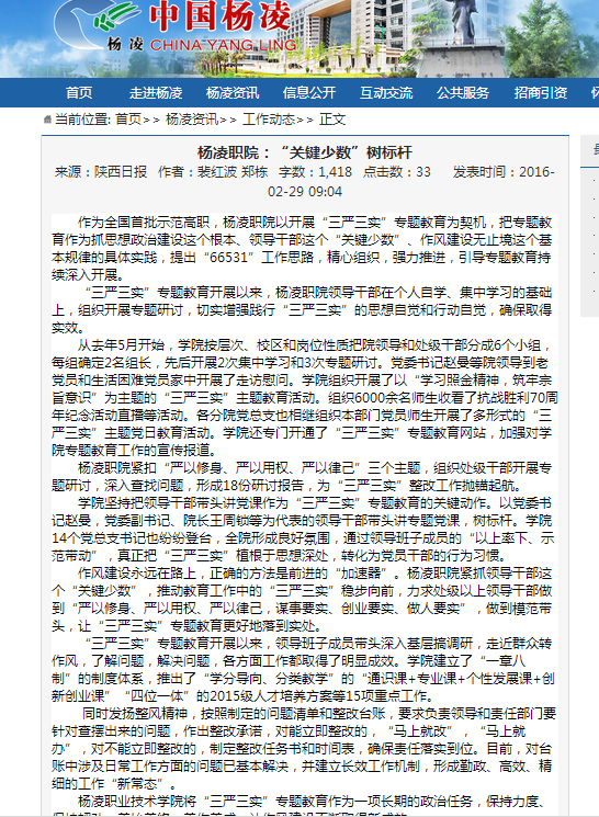 杨凌职业技术学院将“三严三实”专题教育作为一项长期的政治任务,保持力度、保持韧劲,善始善终、善作善成,让作风建设不断取得新成效。