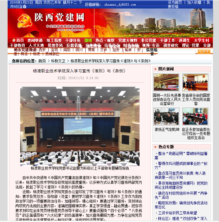 自中共中央颁布《中国共产党廉洁自律准则》和《中国共产党纪律处分条例》以来,杨凌职业技术学院各级党组织高度重视,以多种方式认真学习宣传两部党内法规,掀起了学习《准则》《条例》的热潮。