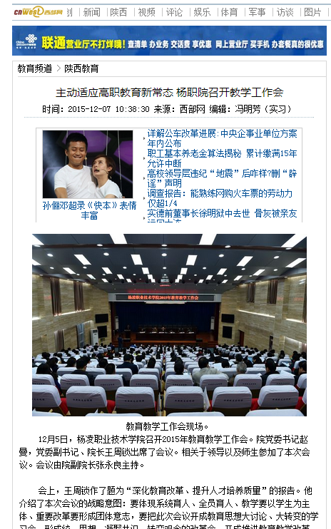 据悉,会议还邀请到天津职业大学原校长,中国高等职业技术教育研究会会长董刚教授为大家作了一场题为《高职教育内涵建设与在思考》的精彩报告。教务处还组织有关人员起草了《杨凌职业技术学院关于实施分类分层教学的意见》等意见和办法。
